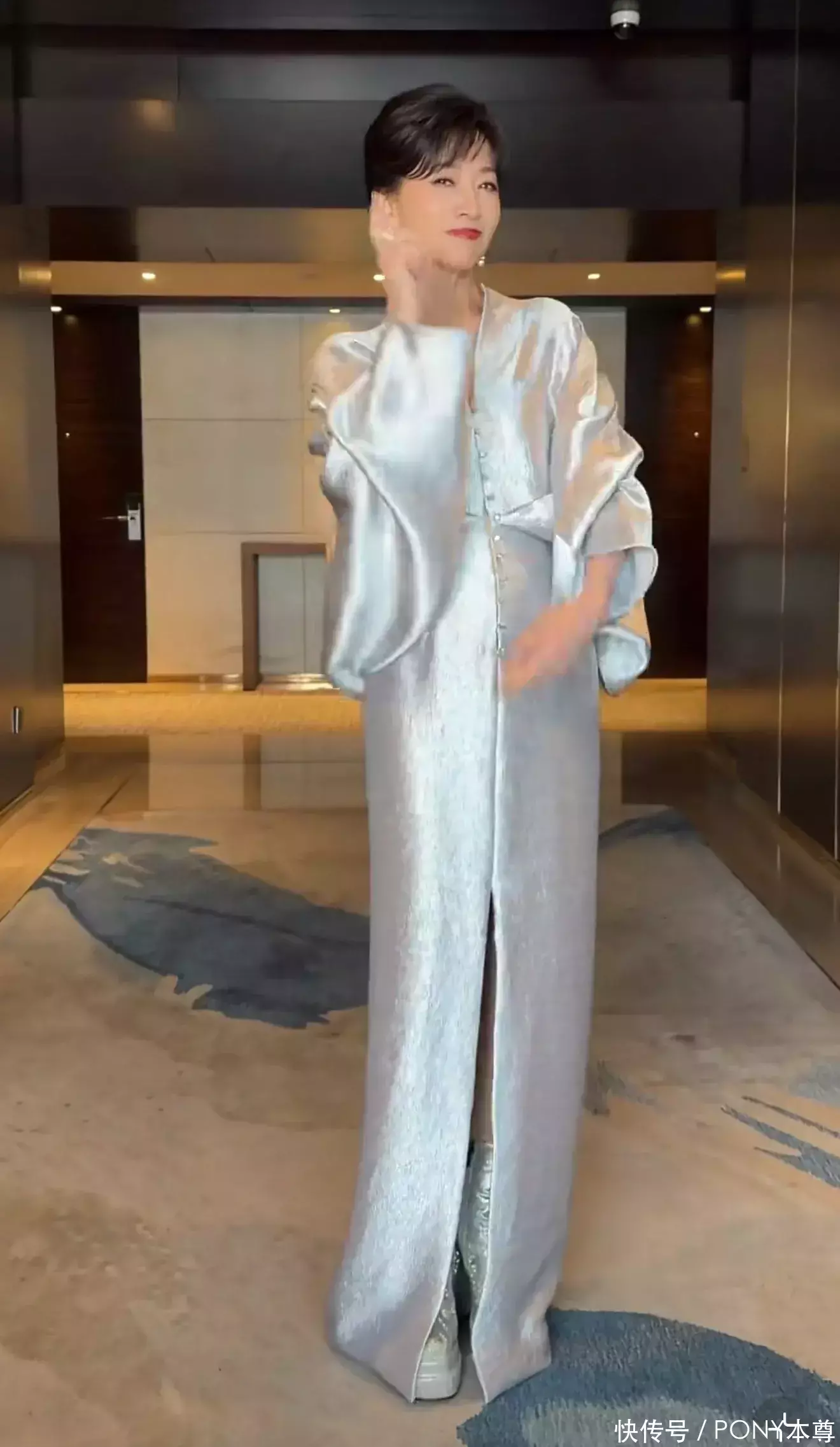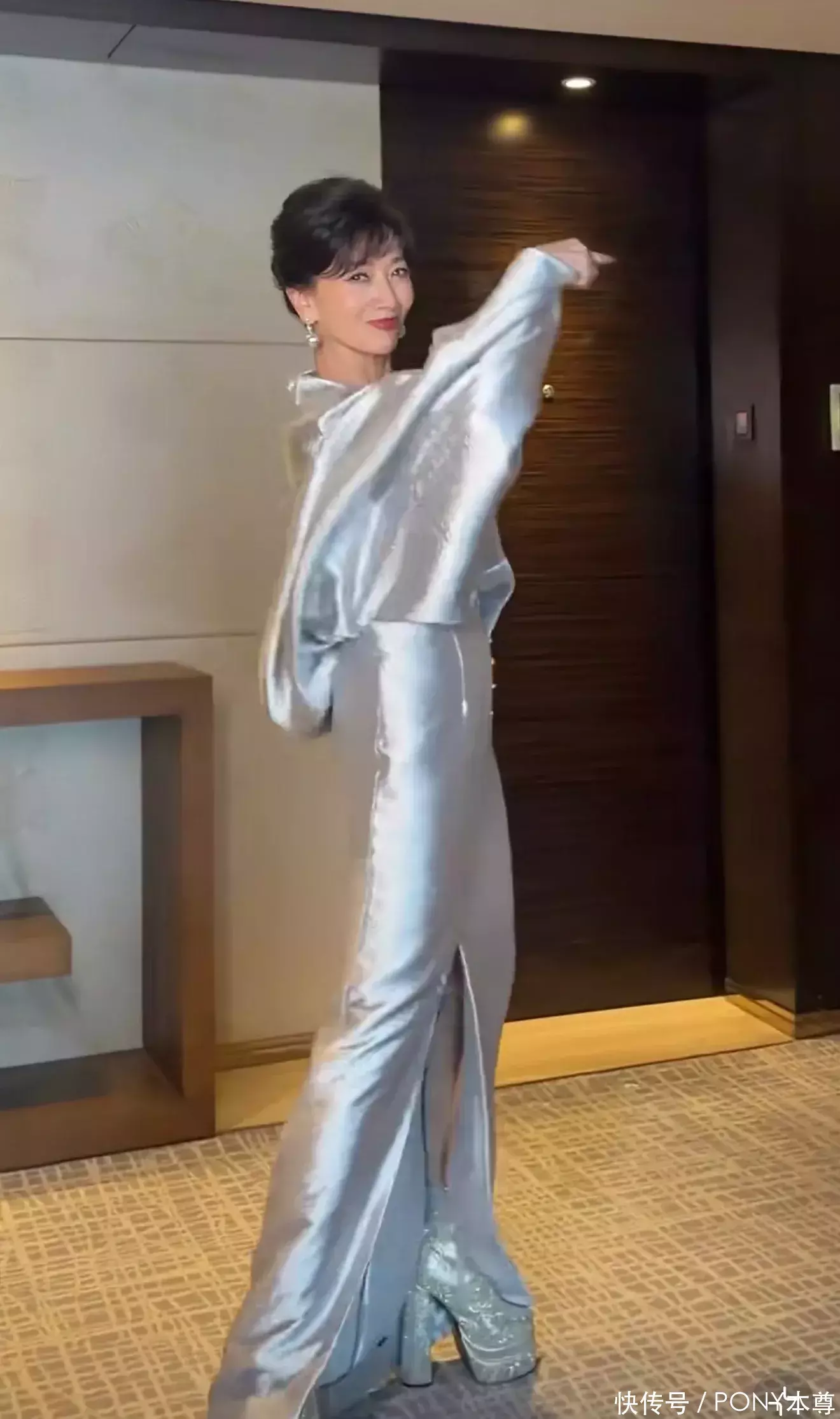 赵雅芝的穿搭风格也是将个人气质和不同场合的需求完美结合起来!比如下面这件蓝色缎面连衣裙,搭配超高防水台短靴,让她的身材看起来高高瘦瘦!